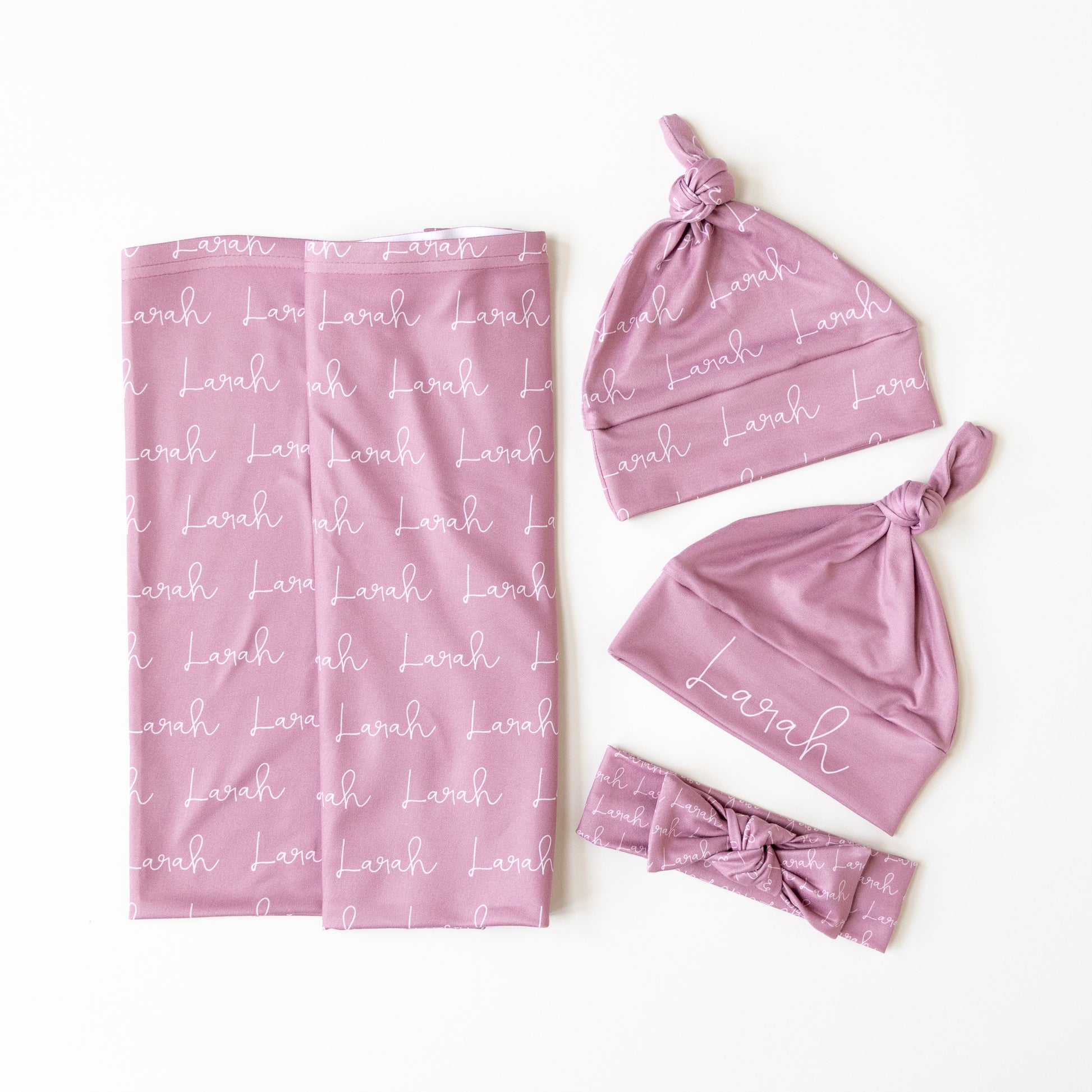Customize your own personalized baby gift set with our stretchy jersey baby blanket and matching accessory. These best-selling sets are amazingly photogenic for life's first treasured moments. The blanket's smooth surface beautifully showcases baby's name while the soft and stretchy fabric wraps your little one in a comfortable, snug swaddle. Choose a hat or bow to make your own cherished gift set.
